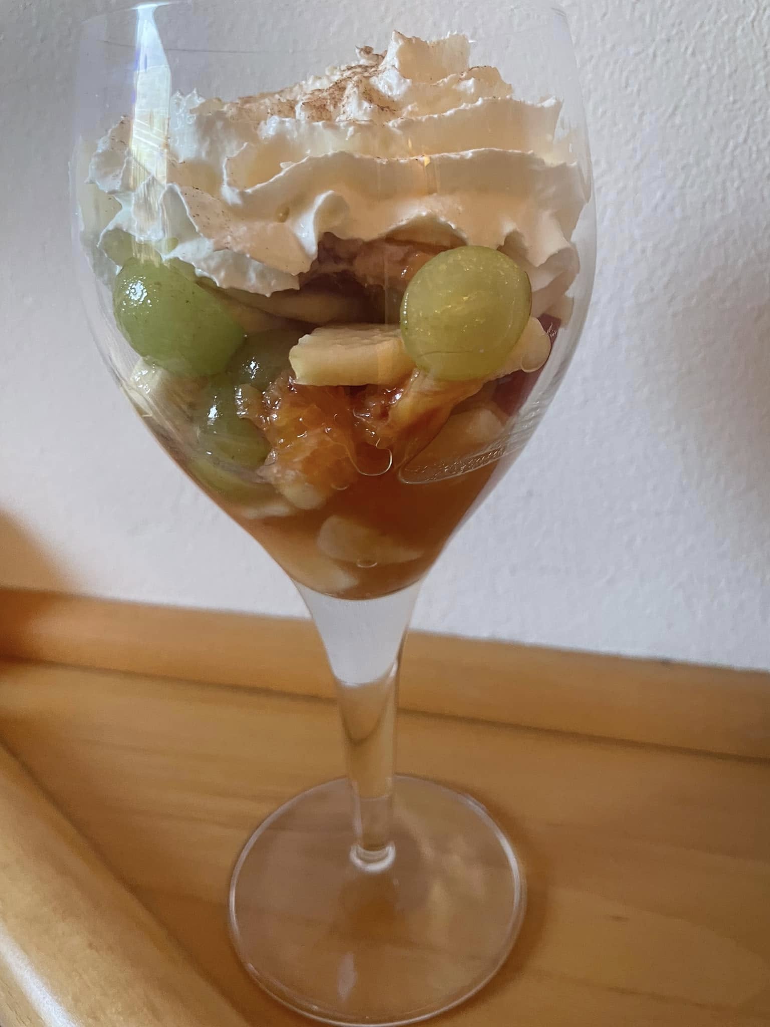 Alles gut verrühren, über das Obst geben und kurz ziehen lassen.