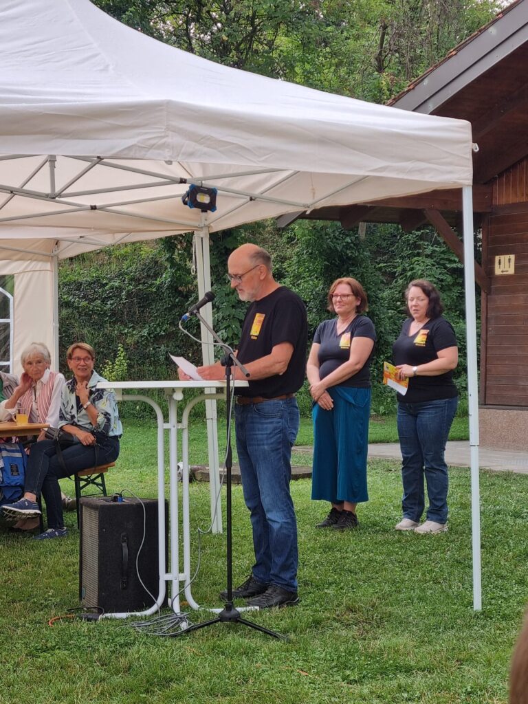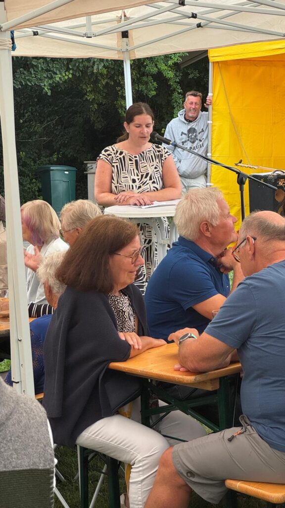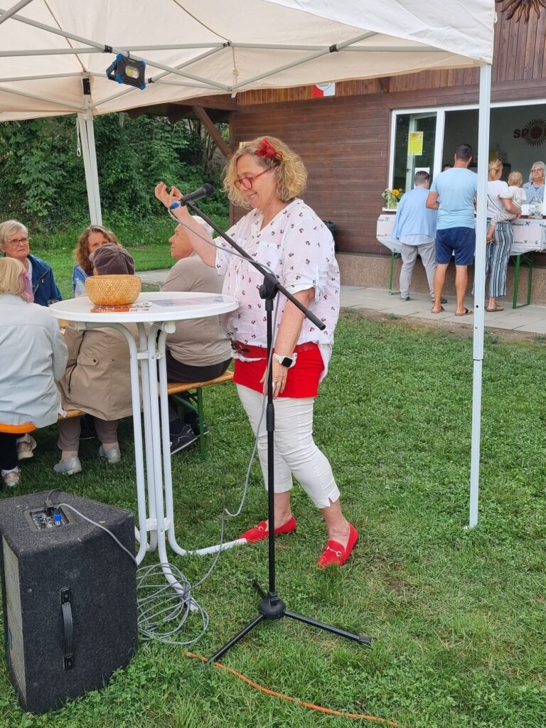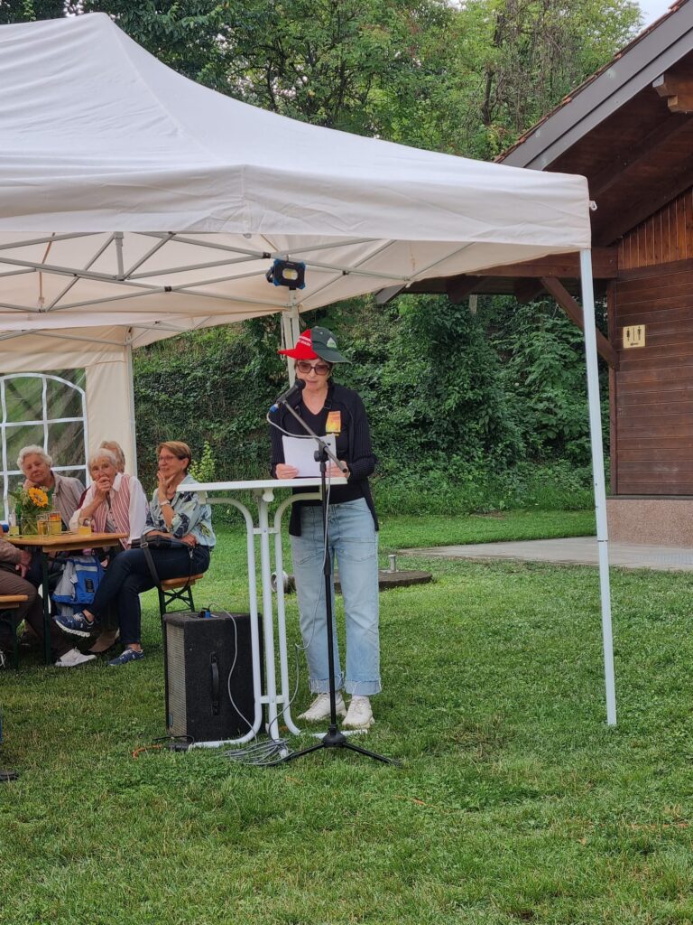 Zwischen den Beiträgen sorgte die Sommerakademieband für musikalische Untermalung, und auch Pepi Hopf selbst trat im Anschluss noch auf – allerdings gegen einen starken Gegner: das schon heiß ersehnte Spanferkel, dessen Duft in der Luft lag und so manche Aufmerksamkeit vom Geschehen auf der Bühne ablenkte.