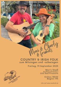 Ein Abend voller Country & Irish Folk zum Mitsingen und -schwingen! Moni & Charly & Friends bringen Lebensfreude, Musik und gute Stimmung auf die Bühne – ganz im Stil von Potluck & Hutspende.