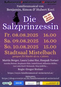 Der neue Kulturverein Familienmusical Weinviertel präsentiert „Die Salzprinzessin“, ein musikalisches Märchen über die Bedeutung der einfachen Dinge im Leben. Das Stück verbindet Pop, Rock und Musical mit Live-Musik und vereint junge Talente der Musicalklasse Mistelbach mit erfahrenen Darsteller:innen.